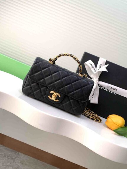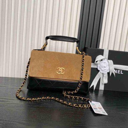 25B Double C Logo Handle CF exquisite handle design highlights fashion. Granulated leather paired with retro metal hardware. Textured, wear-resistant,