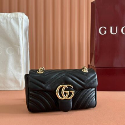 The iconic GG Marmont collection features a double G emblem and a refined chain strap, crafted from soft leather for
