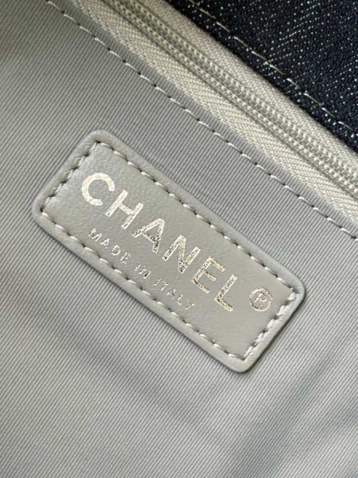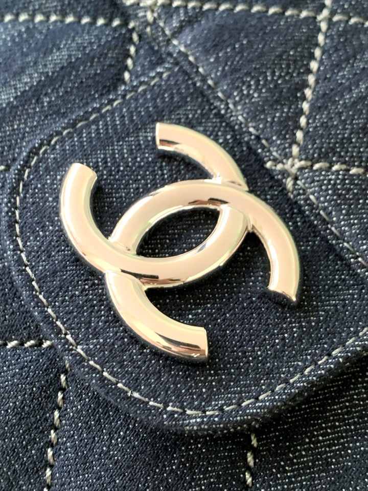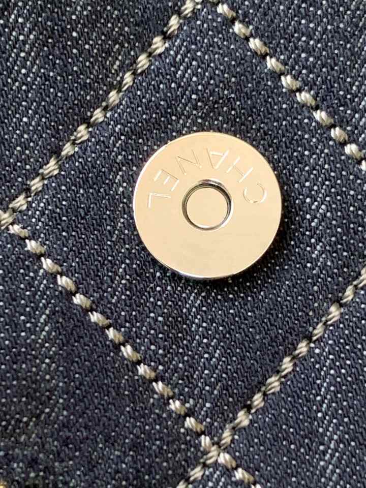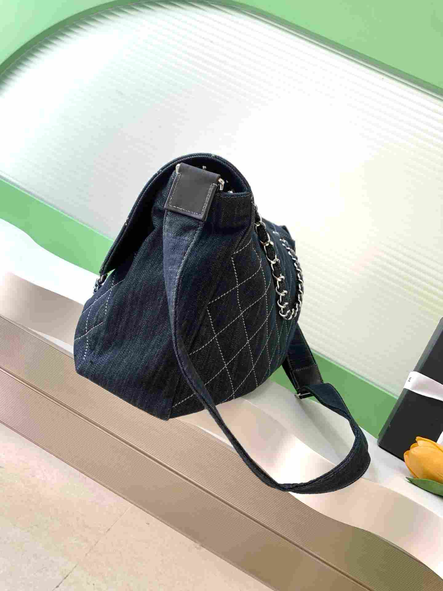The half-denim design adds a casual vibe. Along with the classic leather chain, it comes with an adjustable wide shoulder strap for easy crossbody wear.