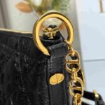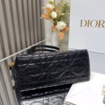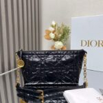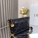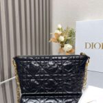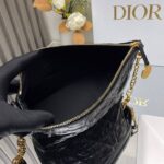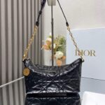 This Diorstar Hobo chain bag is a new addition to the 2024 Spring-Summer ready-to-wear collection, blending stylish design with practicality. Crafted from soft black crinkled calfskin and adorned with oversized cannage motifs, it features a spacious compartment with a zip closure. The circular charm is engraved with the Christian Dior Paris signature and the iconic Dior star, while refined CD rivets add a touch of elegance. The interior is lined with suede calfskin and includes a card slot. The adjustable CD chain strap, paired with a leather strap, ensures comfortable shoulder wear.