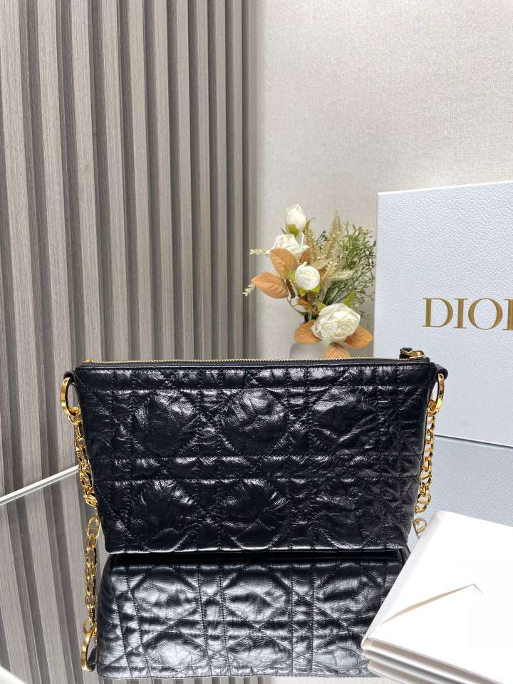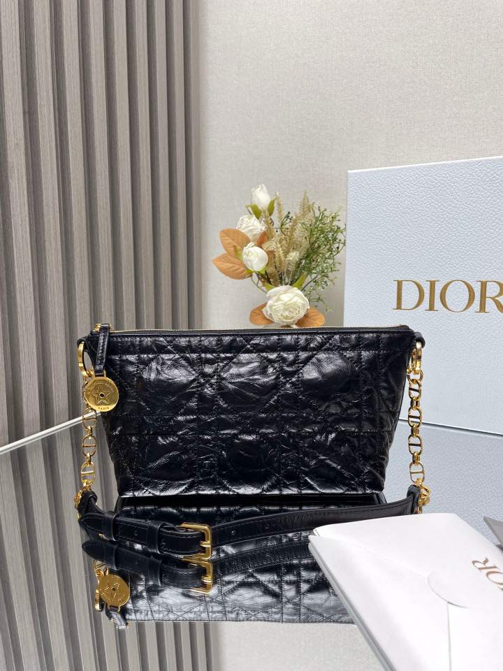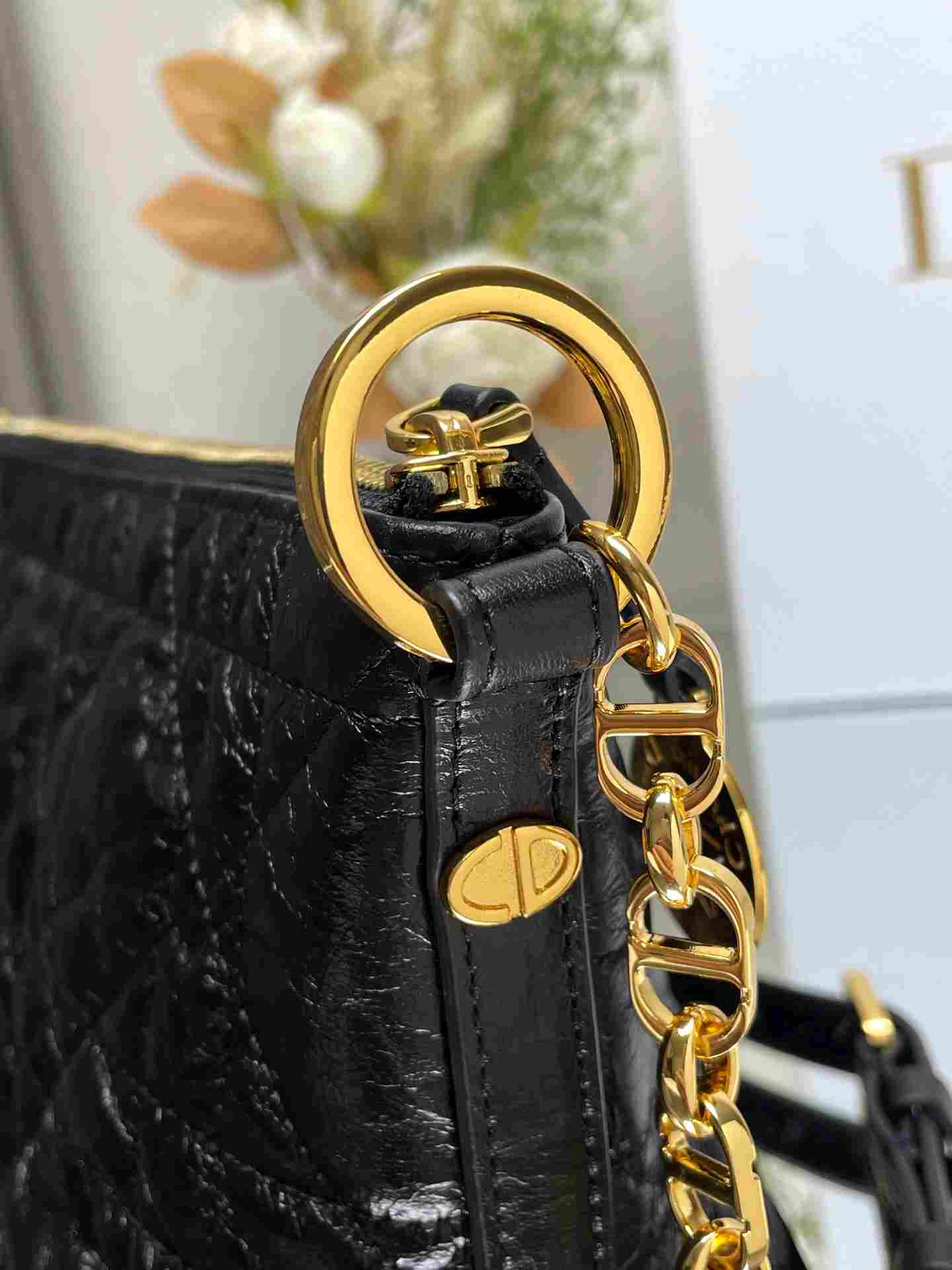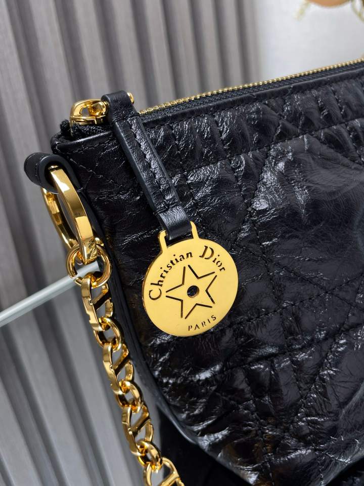 This Diorstar Hobo chain bag is a new addition to the 2024 Spring-Summer ready-to-wear collection, blending stylish design with practicality. Crafted from soft black crinkled calfskin and adorned with oversized cannage motifs, it features a spacious compartment with a zip closure. The circular charm is engraved with the Christian Dior Paris signature and the iconic Dior star, while refined CD rivets add a touch of elegance. The interior is lined with suede calfskin and includes a card slot. The adjustable CD chain strap, paired with a leather strap, ensures comfortable shoulder wear.