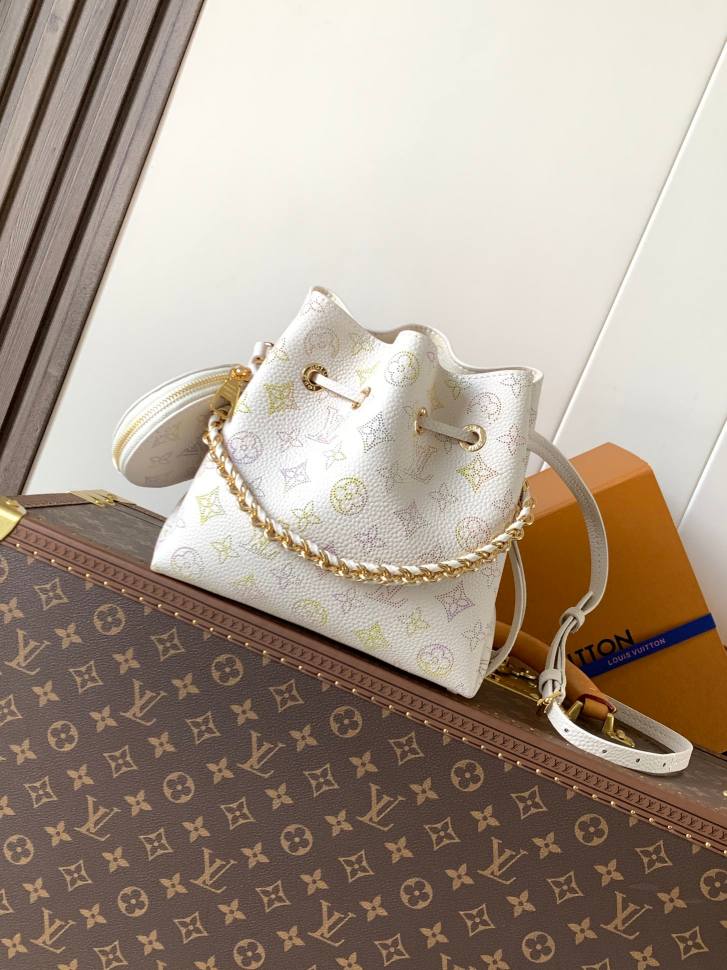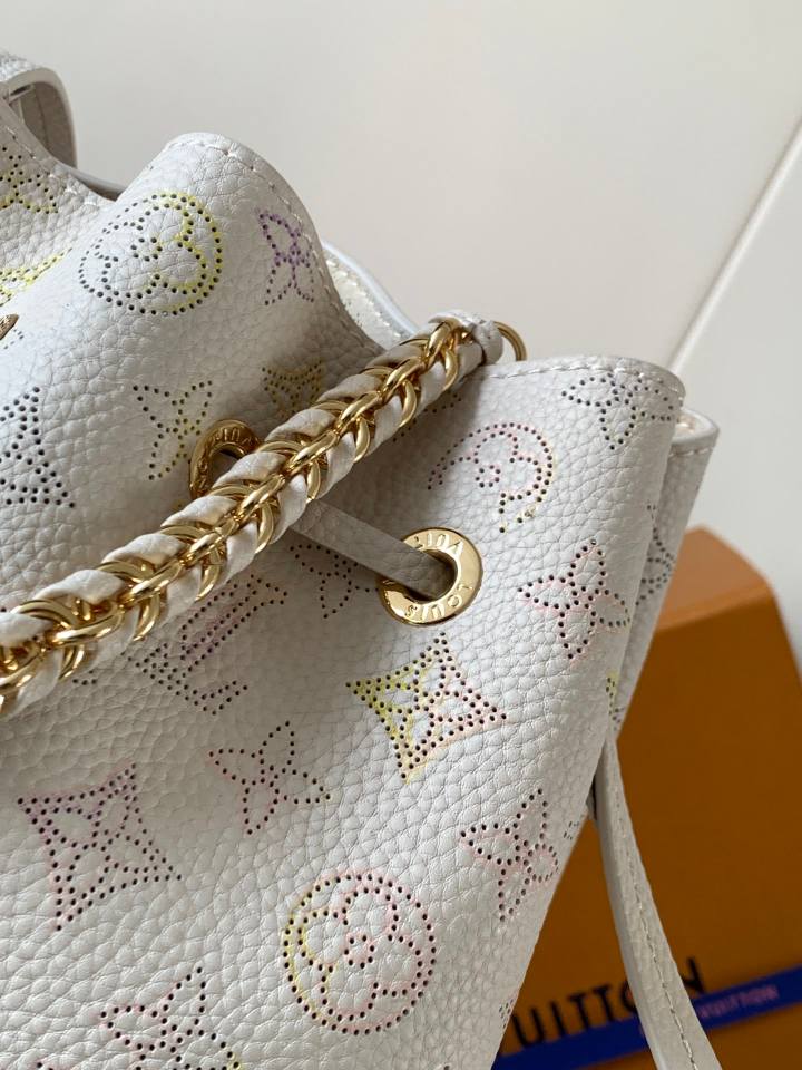This Bella handbag from the Dream collection features Monogram perforated patterns in laser-cut leather, enhanced by watercolor effects for delicate color contrasts. Detachable woven chain hardware accents the refined silhouette, while a rounded coin pocket ensures organized storage.