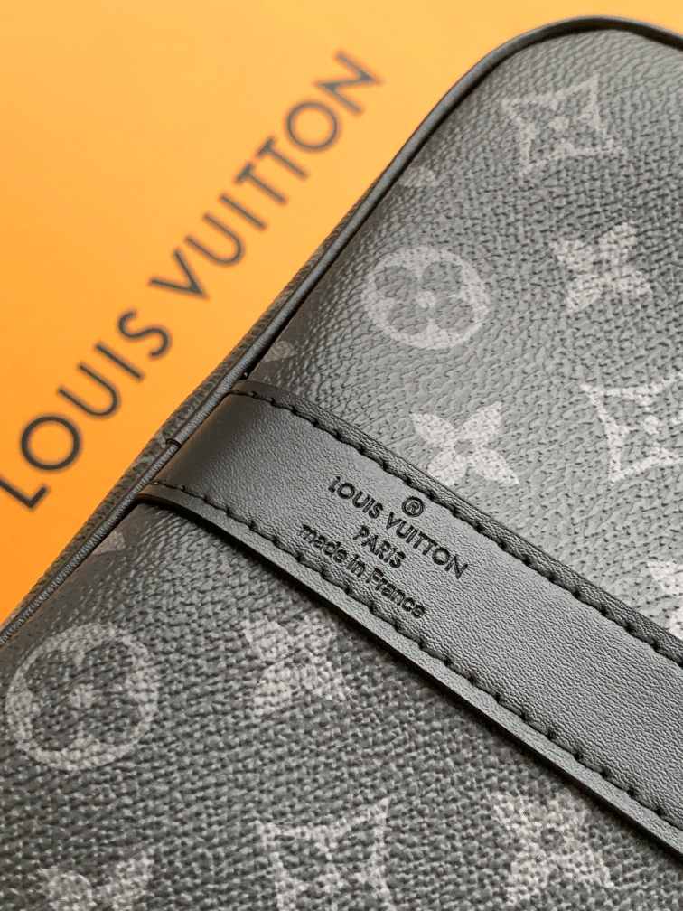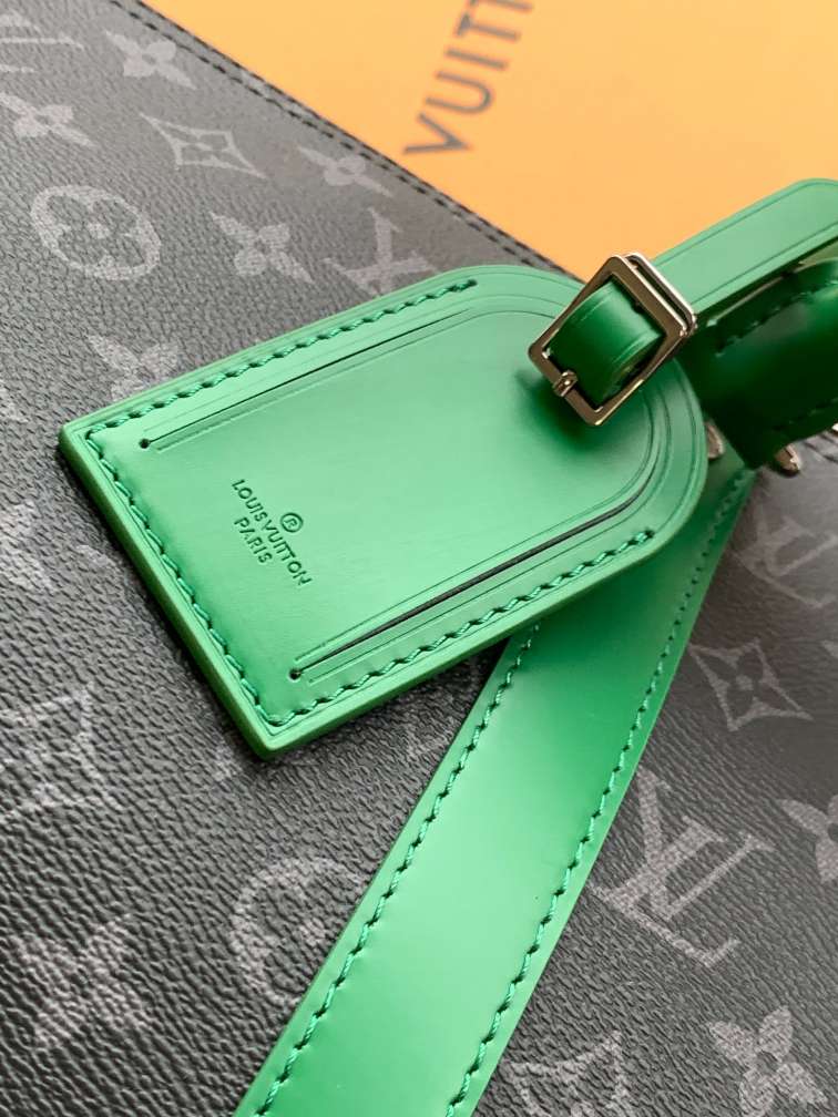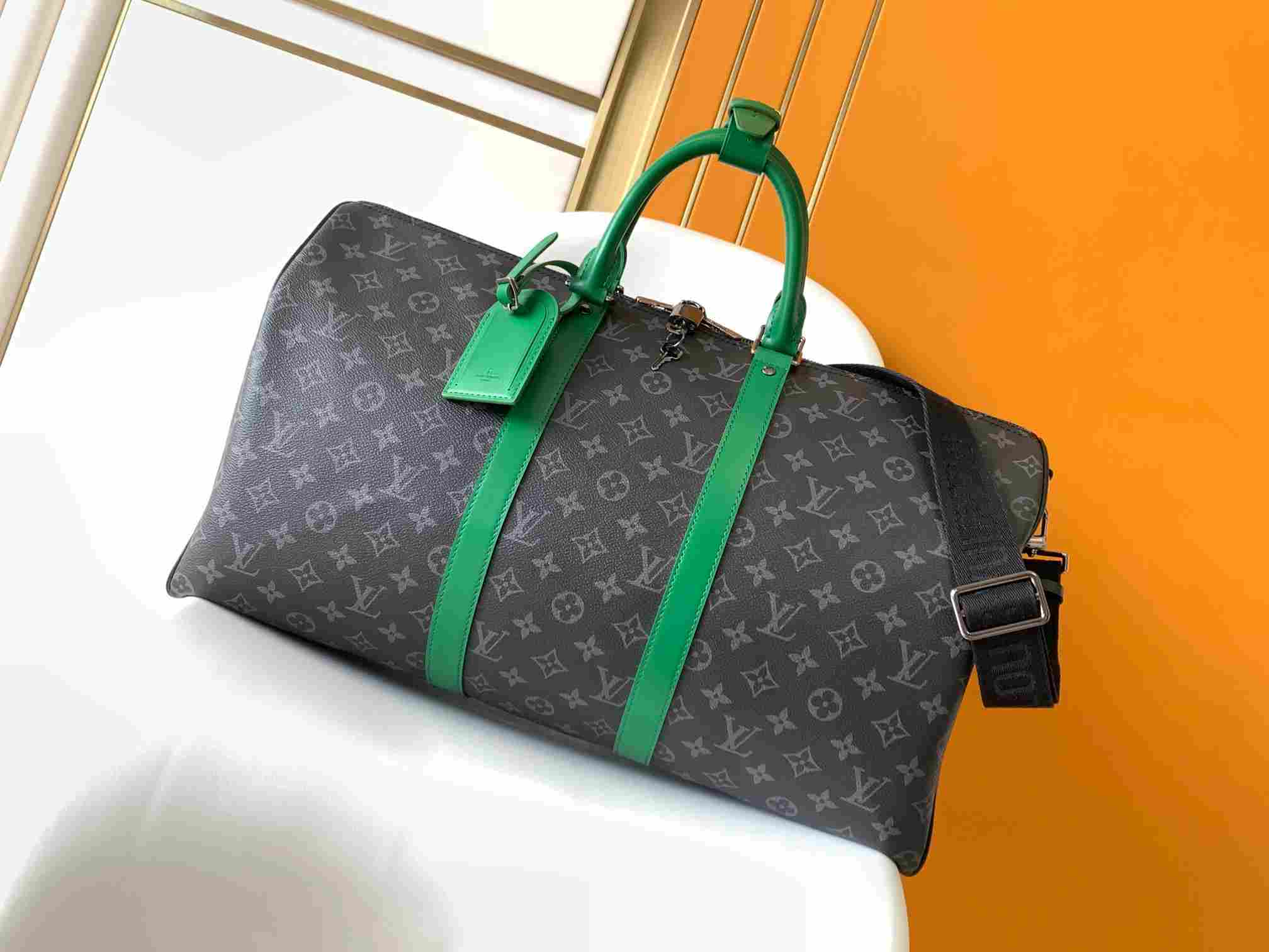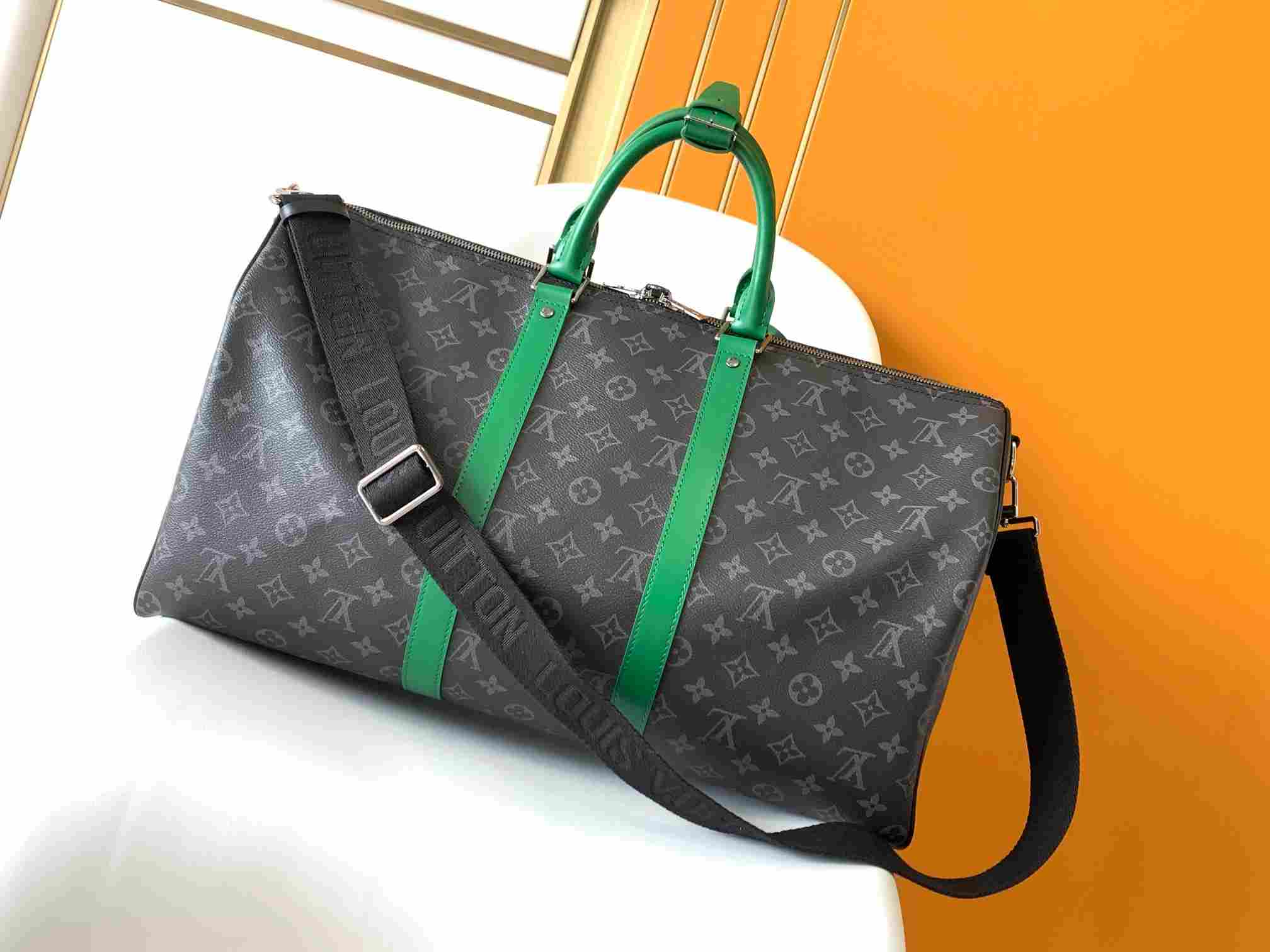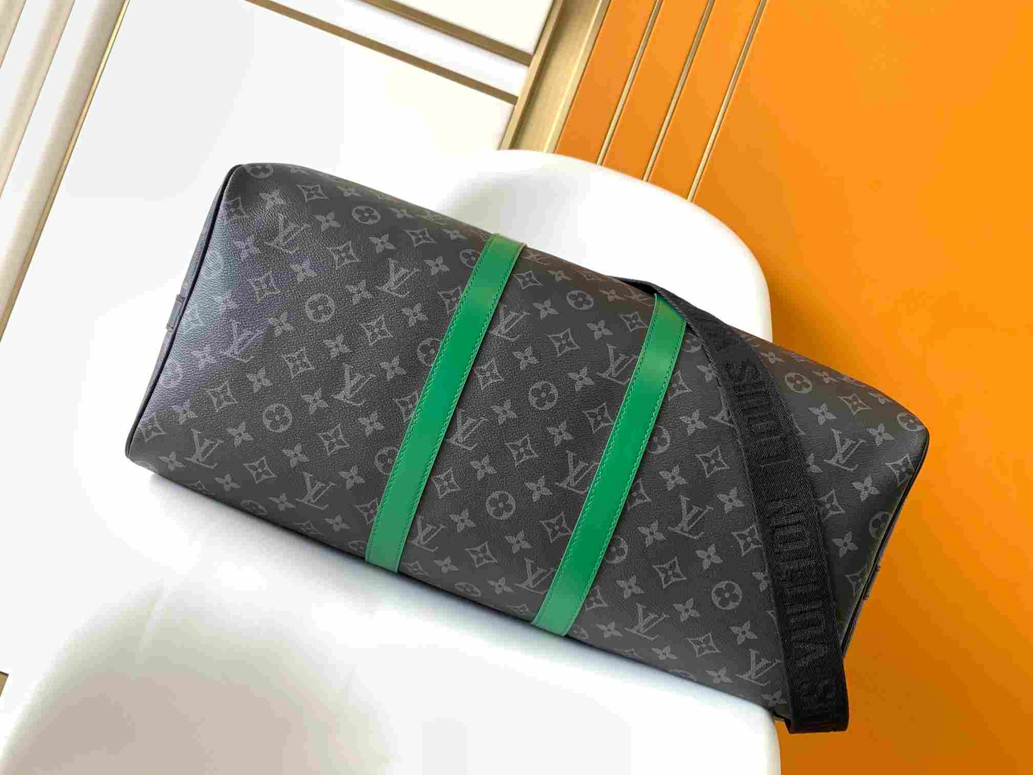 The M15253 Black/Flower Orange 55CM 163c01 size-changing chip Keepall 55 travel bag is crafted from Monogram Eclipse canvas, featuring vibrant leather trim on the flanges, borders, and side straps. It comes with a black removable adjustable shoulder strap and a matching lining, along with a zippered interior pocket for organized storage. This practical model is compact yet spacious, making it ideal as hand luggage.