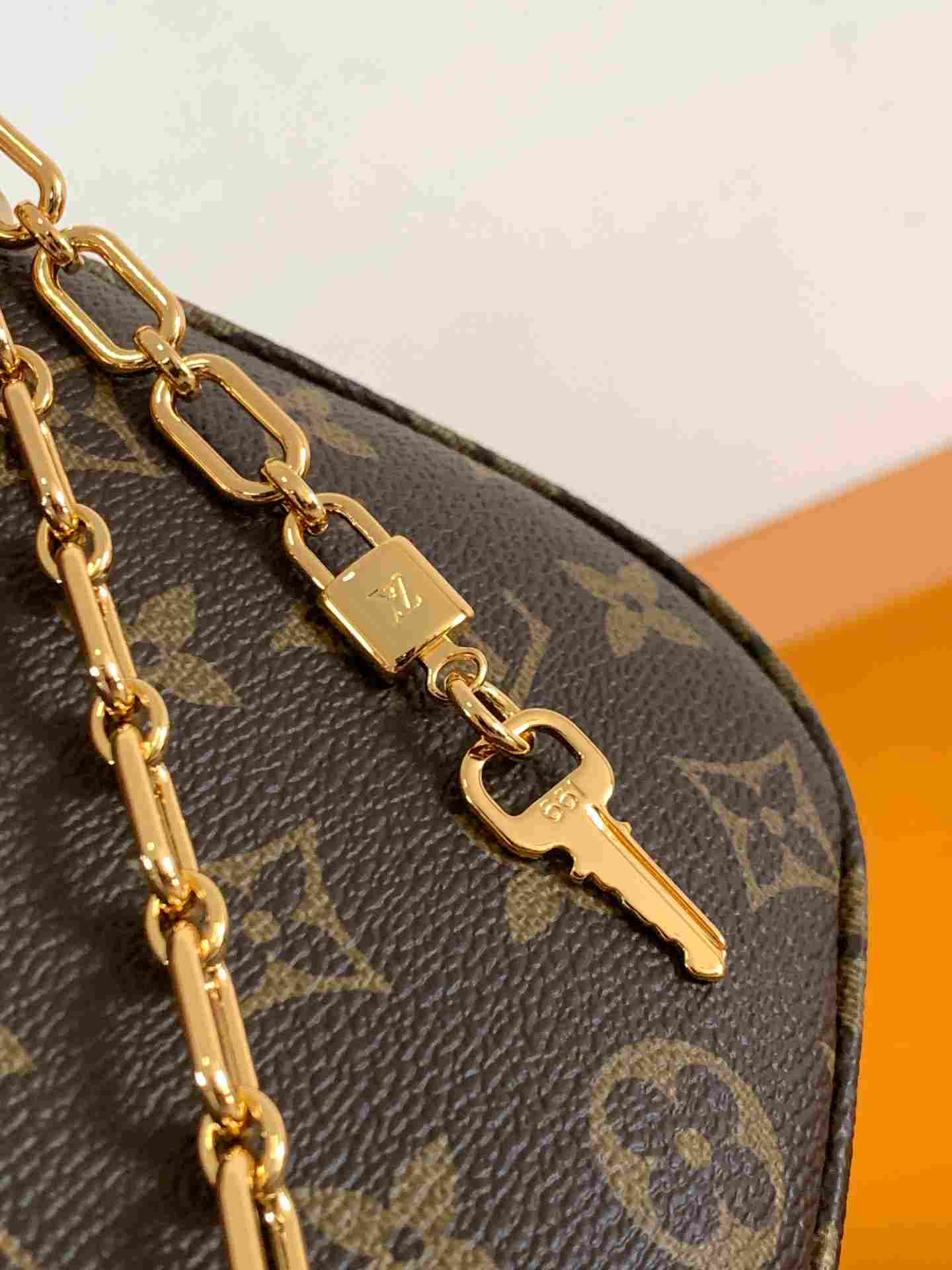 This Catchy Pochette bag features a canvas construction with cowhide leather trim, showcasing the classic Monogram motif as a tribute to the brand’s heritage, offering another sleek choice. Its clean silhouette ensures effortless daily carry, while dual sliding straps allow adjustable shaping. The detachable metal chain and key-shaped charm add playful contrast.