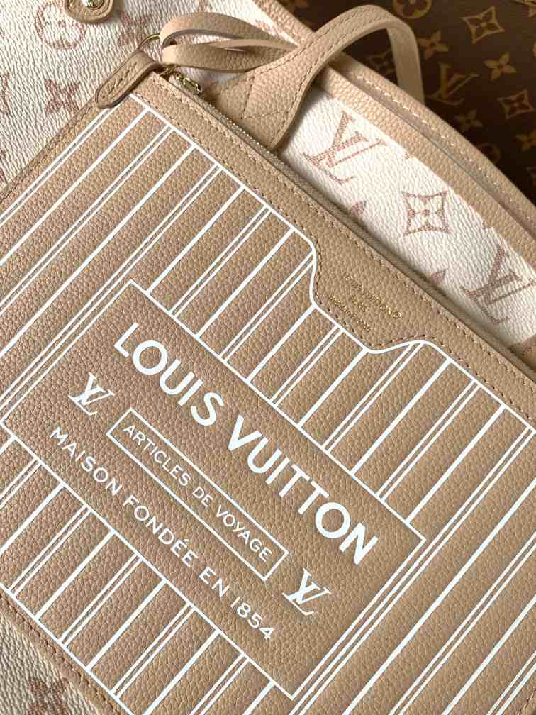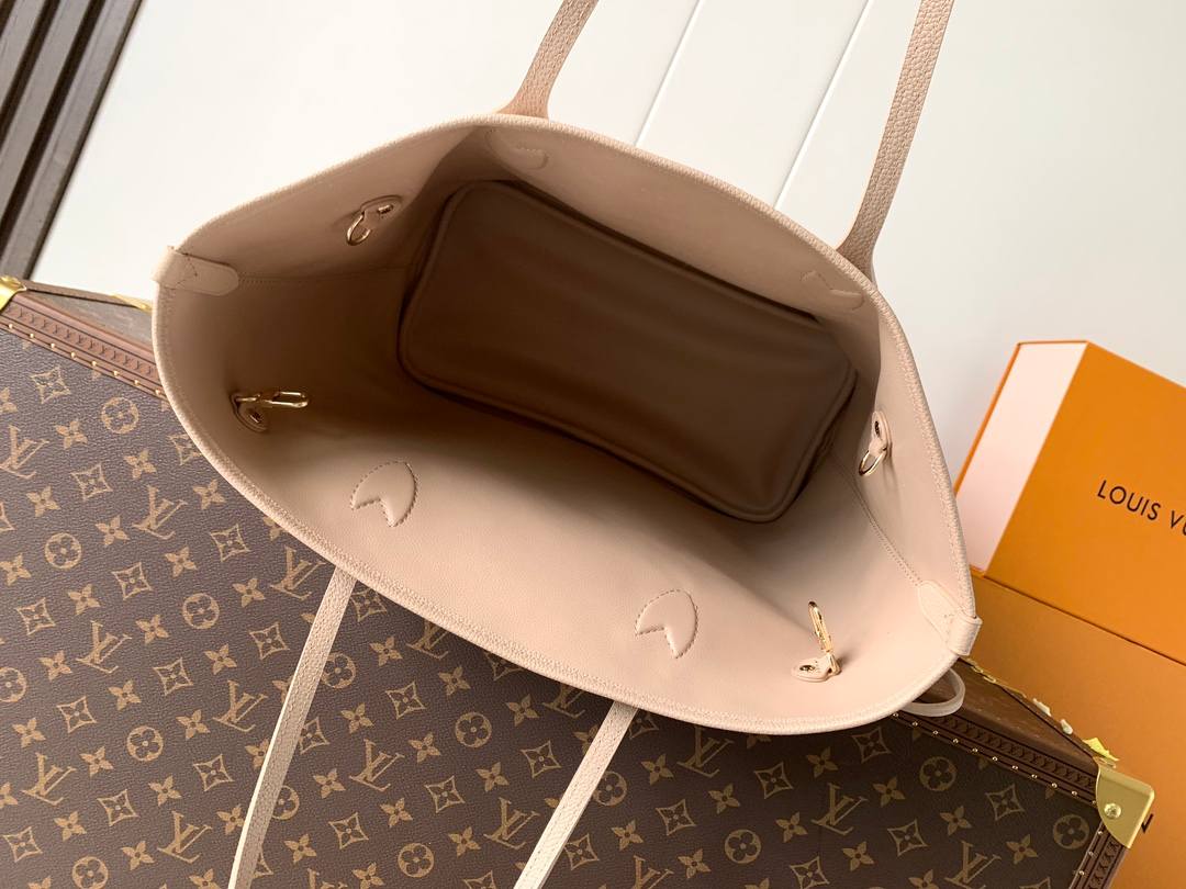 The Neverfull Inside Out MM showcases a fresh dual-sided design with Monogram canvas and grained leather, while its detachable pouch can transform into an exterior pocket or a sleek crossbody bag.