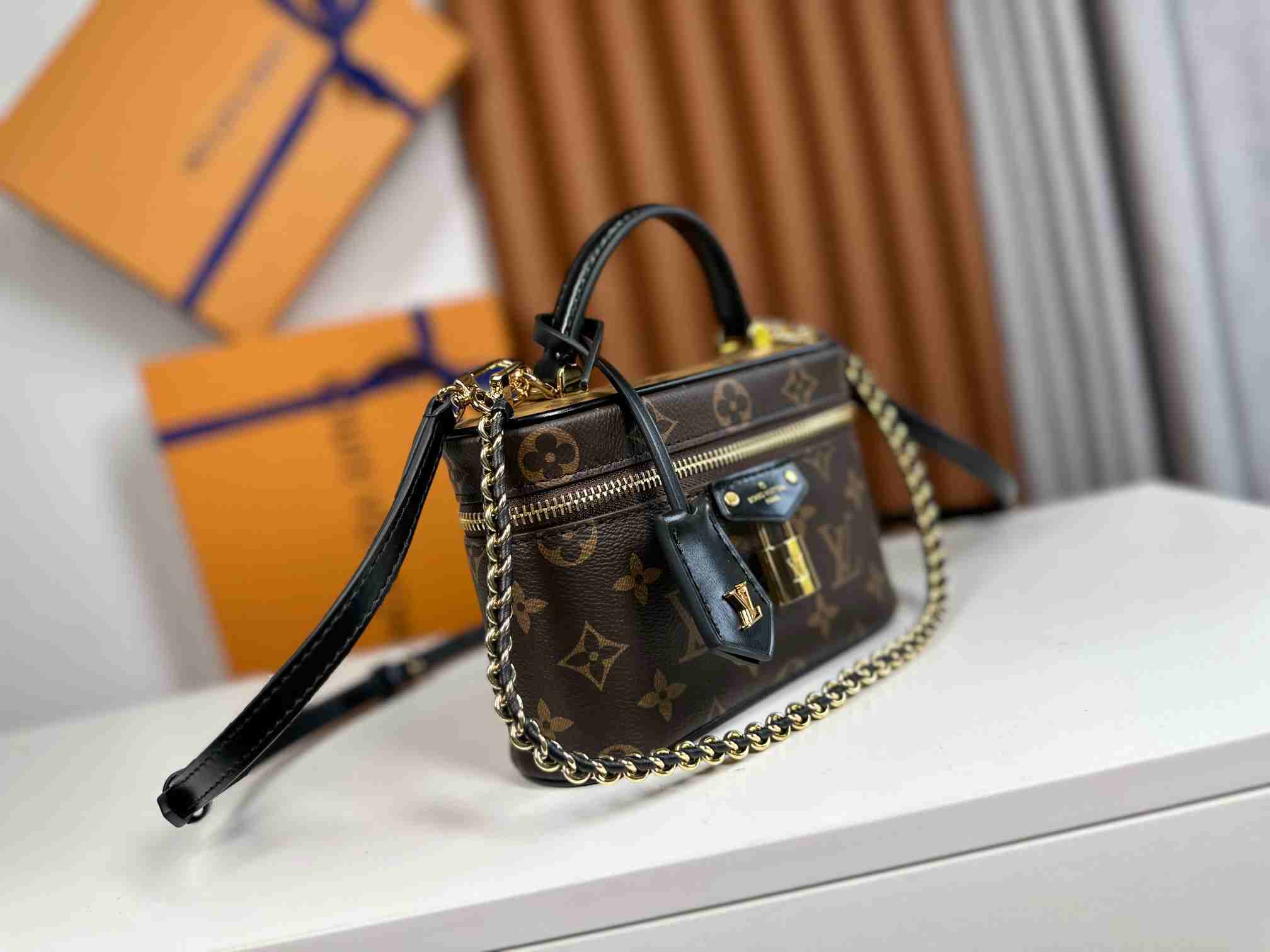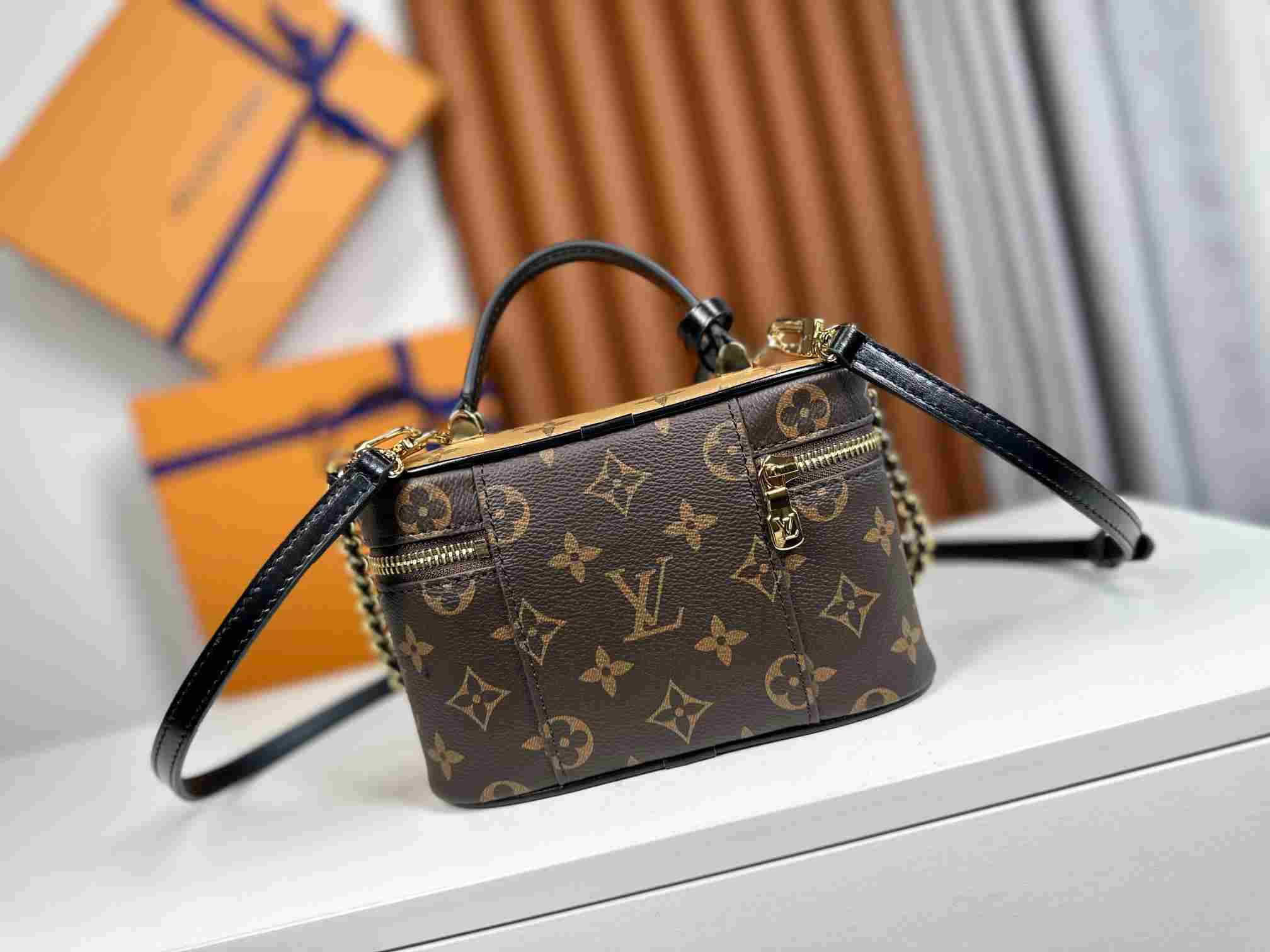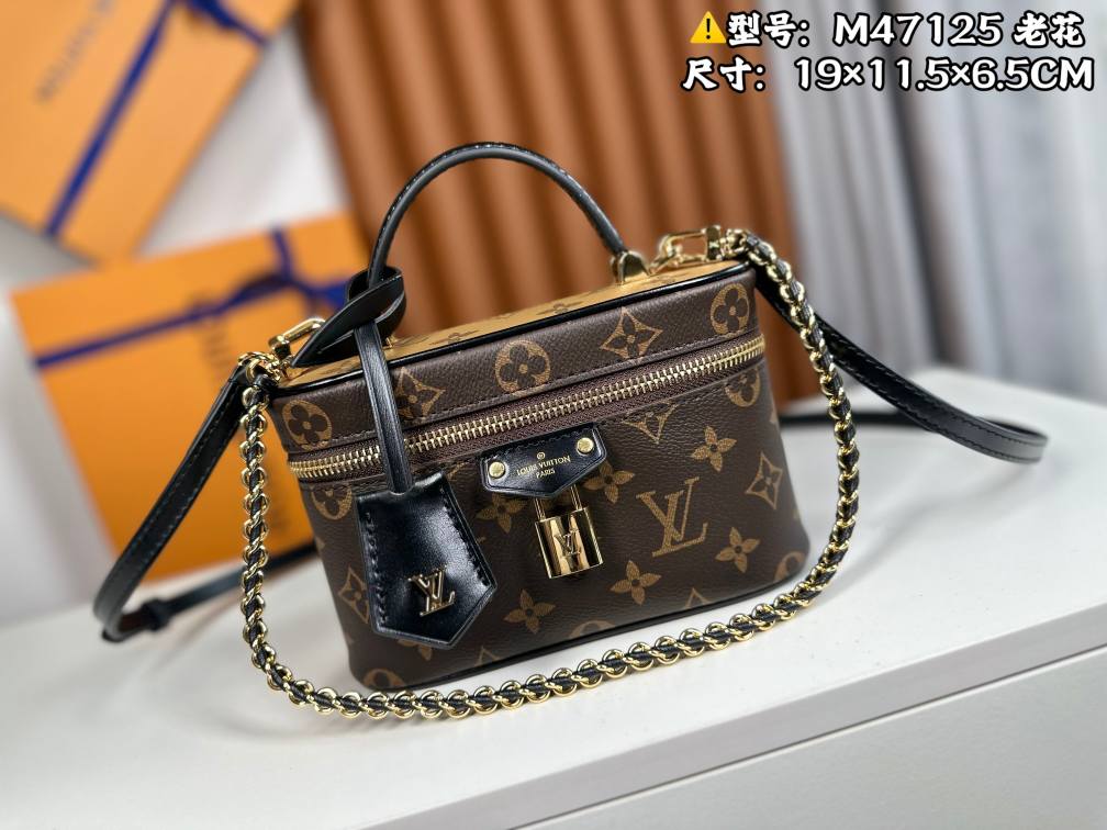 【163c chip version】🌾🌾 The Vanity Chain Pouch draws inspiration from classic makeup cases, embodying the spirit of travel in Monogram canvas. The top handle and detachable woven chain feature leather accents, complementing the bag’s clean lines. LV-stamped padlock and leather key pouch延续 signature details. Ref. M47125 🌺🌺 Dimensions: 19×11.5×6.5CM
