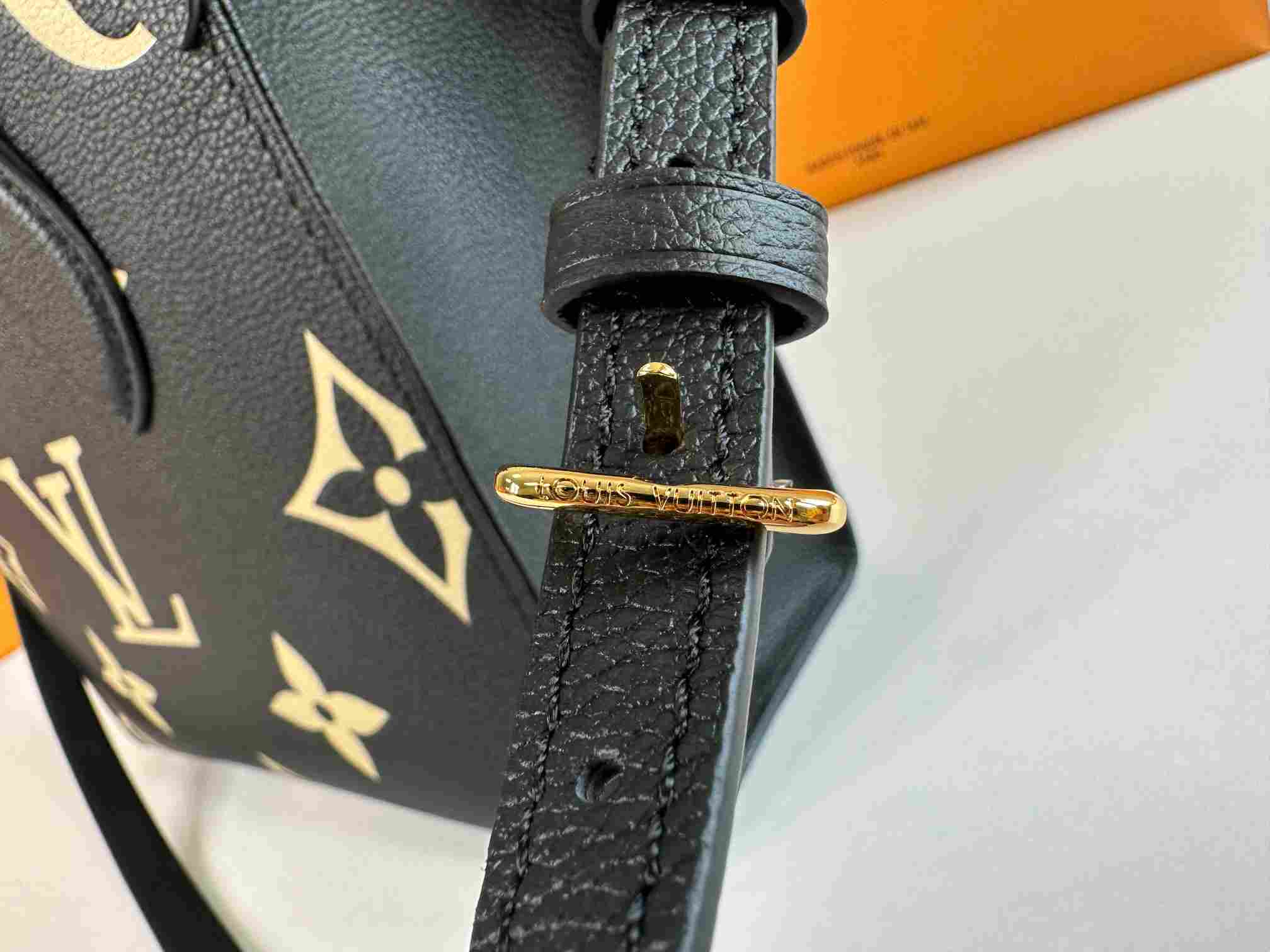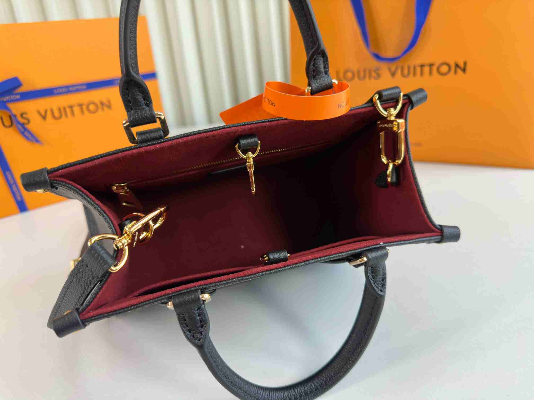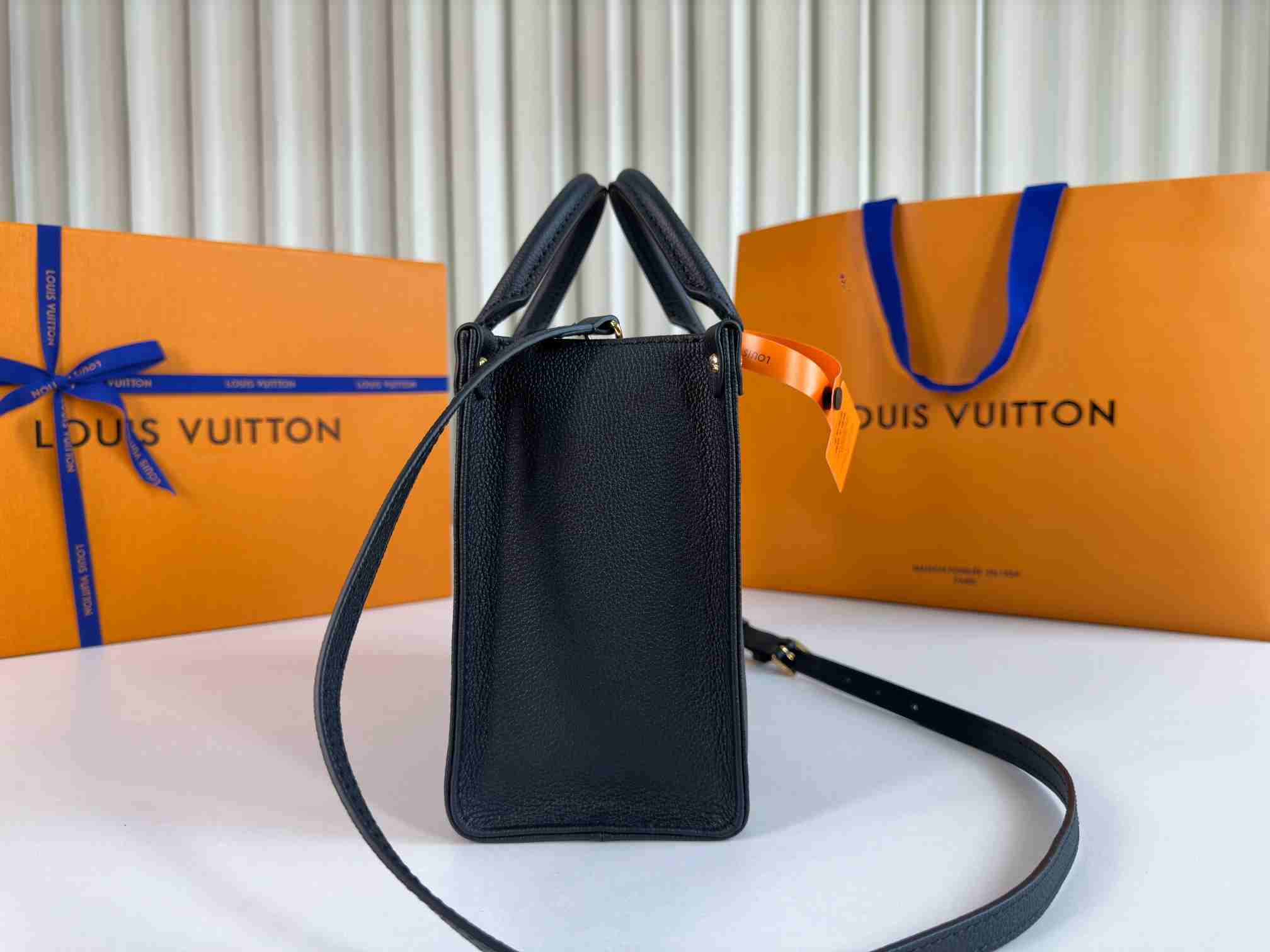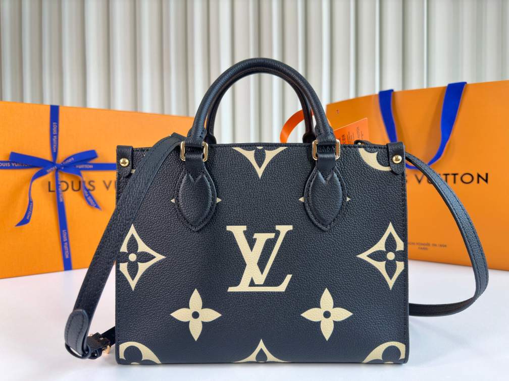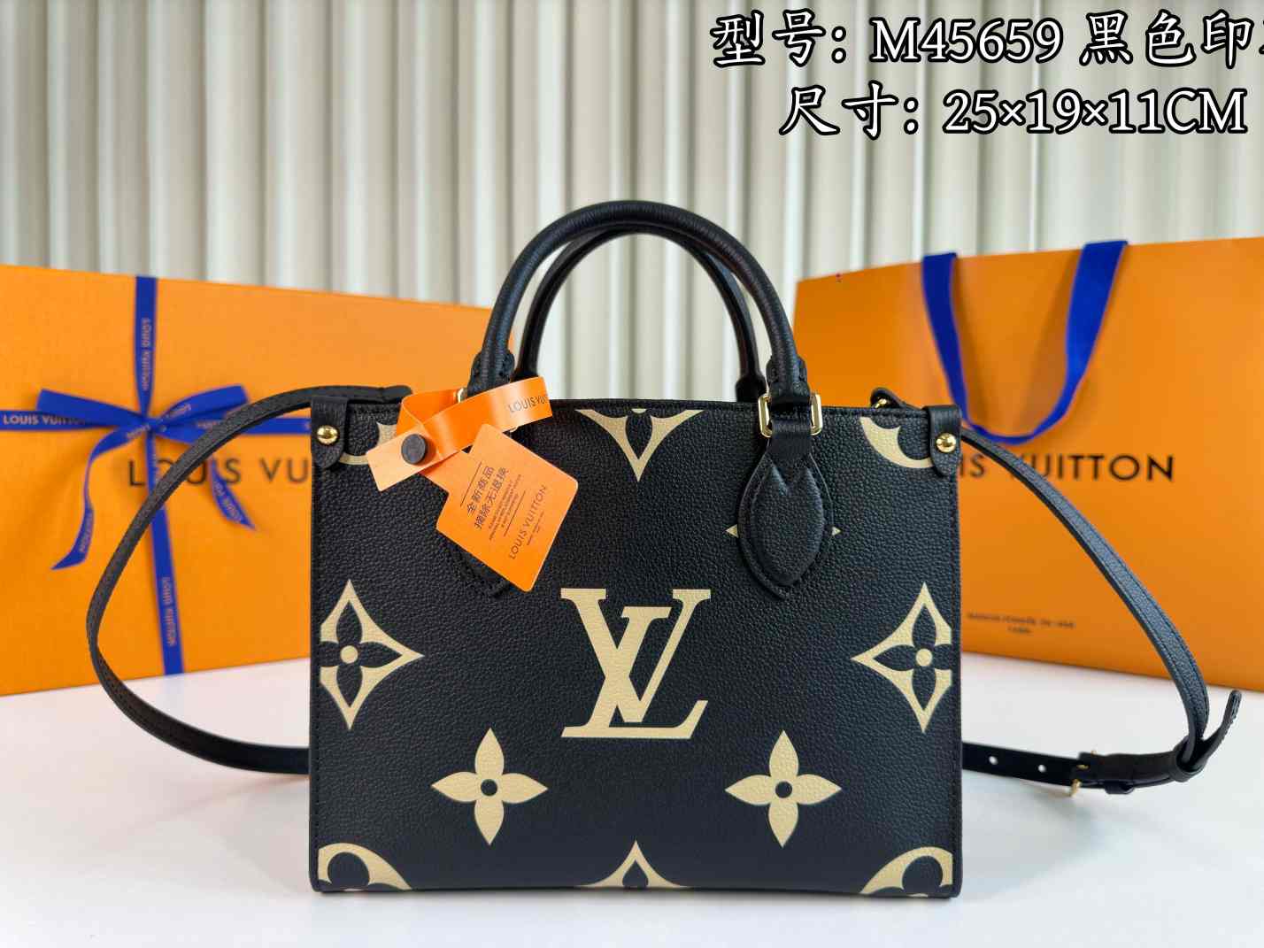 45659 Black Print. This OnTheGo Tote features Monogram patterns printed and embossed on soft grained calf leather, with a spacious interior for laptops and office essentials. Fully leather-embossed large-floral mommy bag (small BB size), equipped with dual handles for hand-carry or shoulder wear. Dimensions: 25×19×11CM.